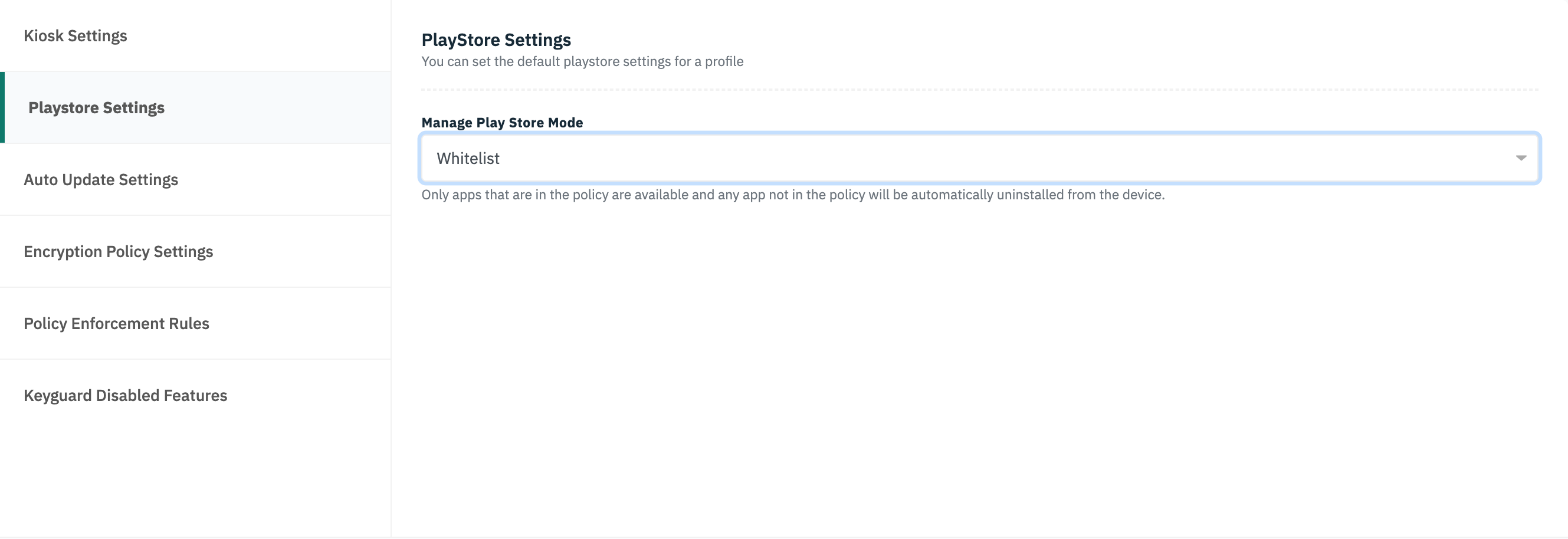 The Whitelisted PlayStore means that the public PlayStore is not accessible. Only the applications selected in the Profile will be available.