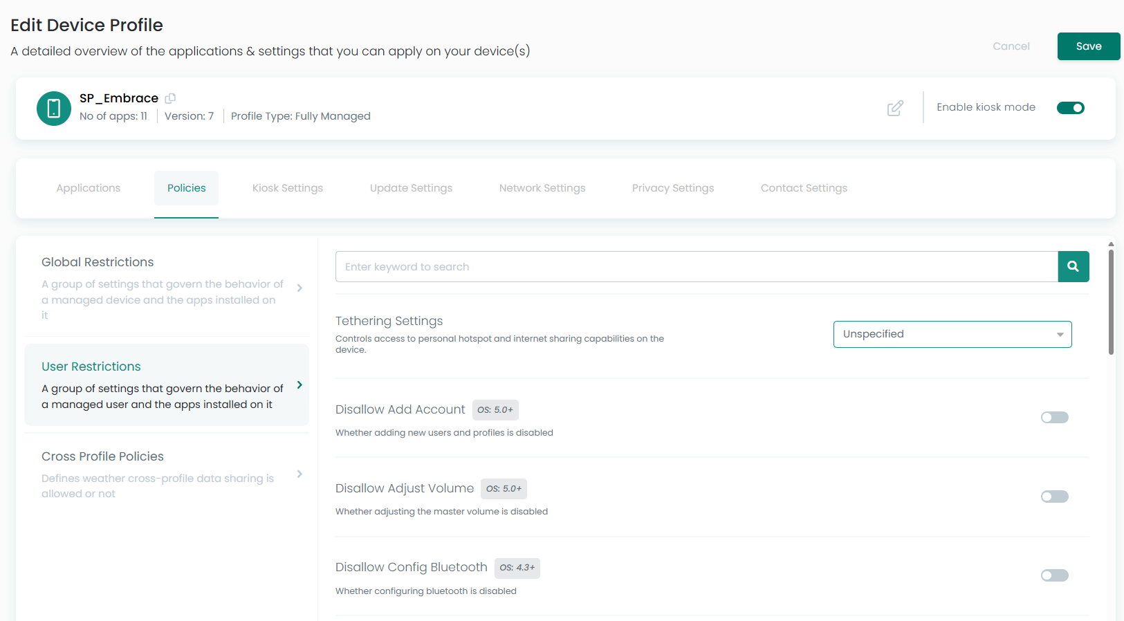 Policies tab includes a list of 50+ policies allow you to configure Bluetooth, Status Bar, Settings, Camera etc.